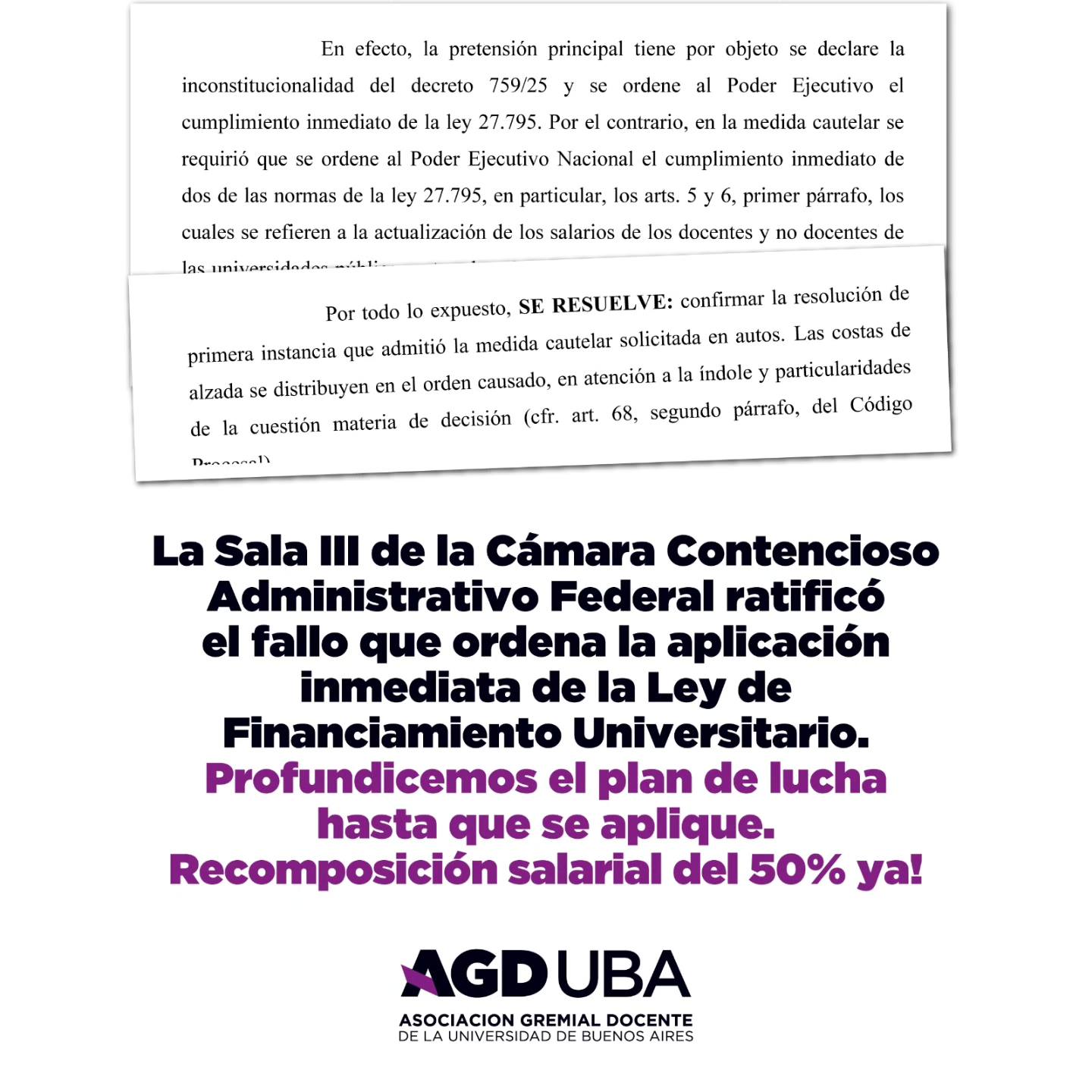 La Sala III de la Cámara Contencioso Administrativo Federal ratificó el fallo que ordena la aplicación inmediata de la Ley de Financiamiento Universitario. Profundicemos el plan de lucha hasta que se aplique. Recomposición salarial del 50% ya! Mirá el fallo completo: https://agduba.org.ar/wp-content/uploads/doc1717322881.pdf