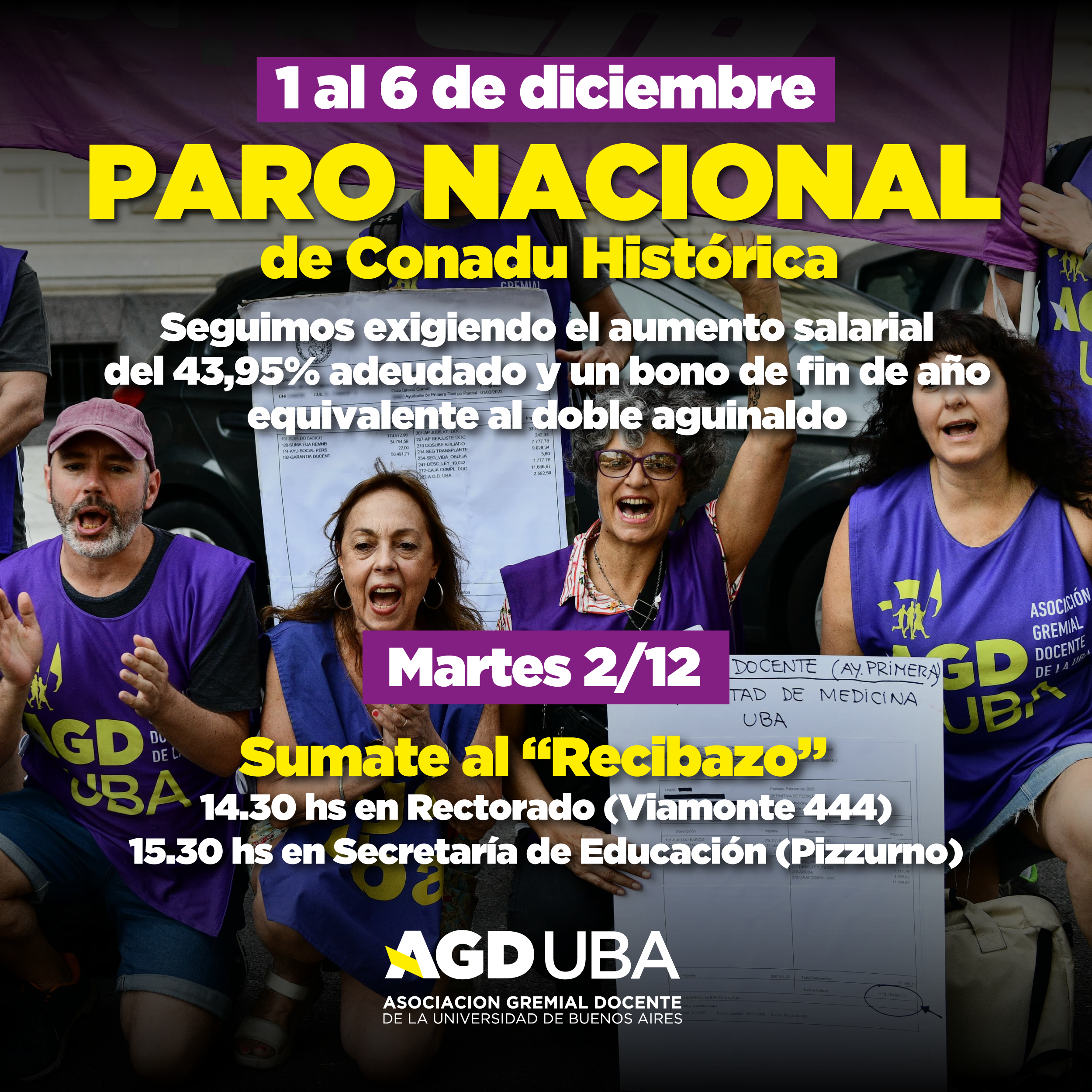 Seguimos exigiendo el aumento salarial del 43,95% adeudado y un bono de fin de año equivalente al doble aguinaldo. Martes 2/12Sumate al “Recibazo”14.30 hs en el Rectorado (Viamonte 444)15.30 hs en la Secretaría de Educación (Pizzurno)