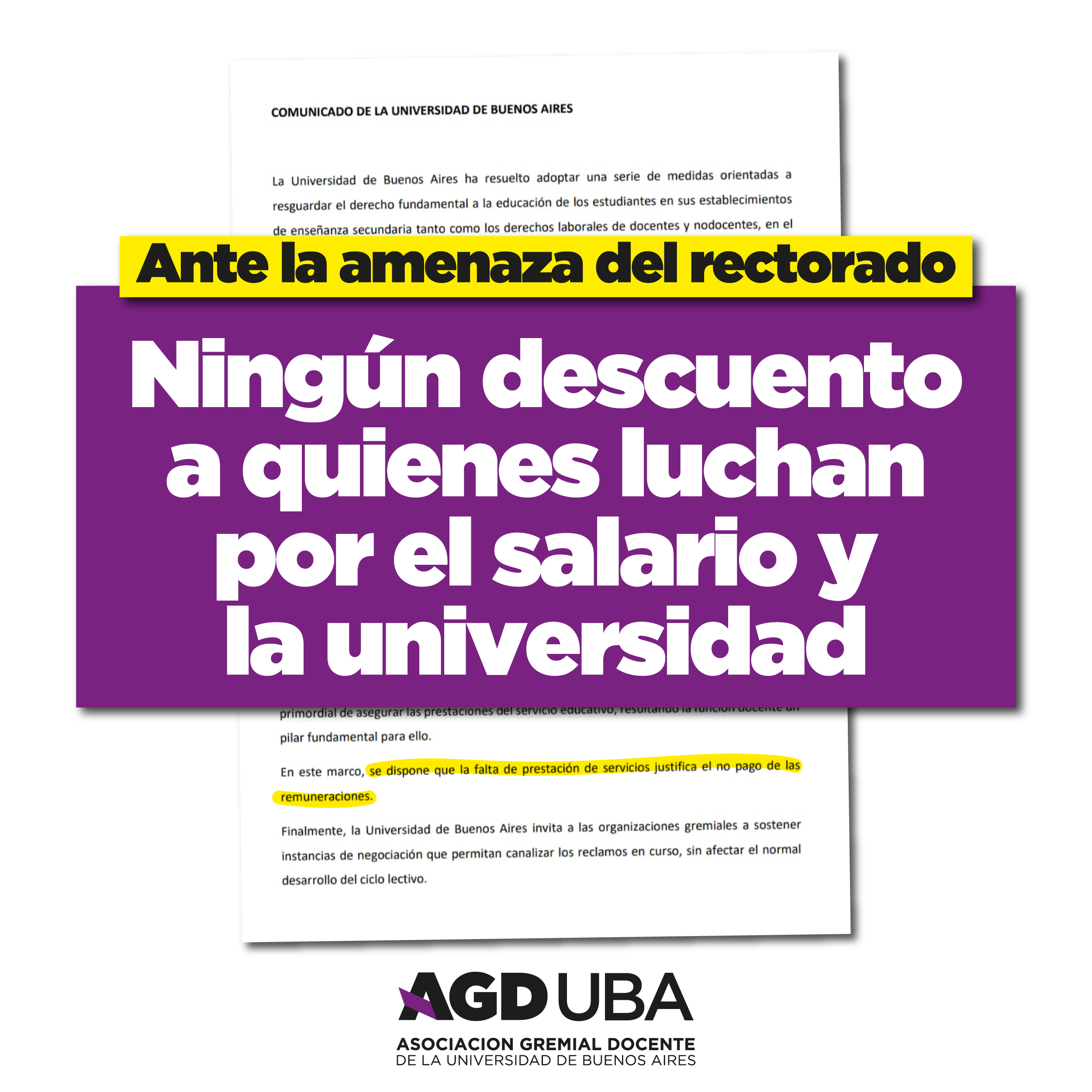 Nuestros reclamos son los siguientes: aumento de salario en camino de la recomposición salarial: media canasta para el cargo testigo (ayudante de 1º con dedicación semiexclusiva). Rechazo a los pagos en cuotas y de las paritarias a junio firmadas por Feduba, Aduba y UTE. Por la reapertura de la Mesa de Negociación Salarial y Paritarias Nacionales libres, con delegados electos y mandato de asamblea. Por la eliminación del impuesto a las ganancias y del tope a las asignaciones familiares.
