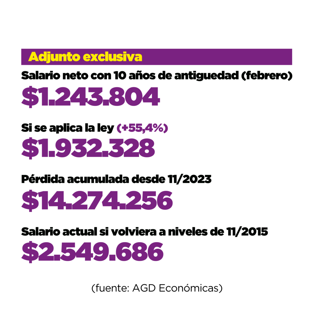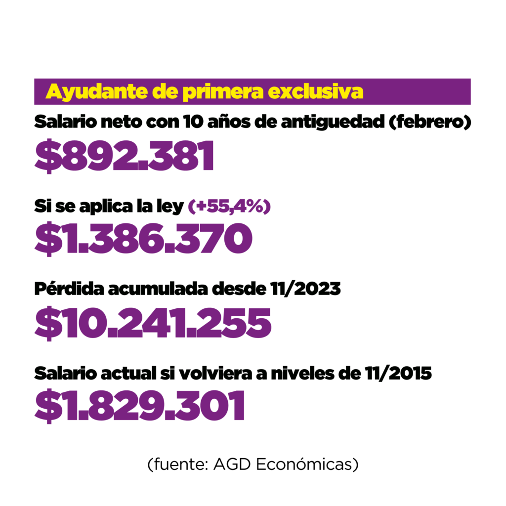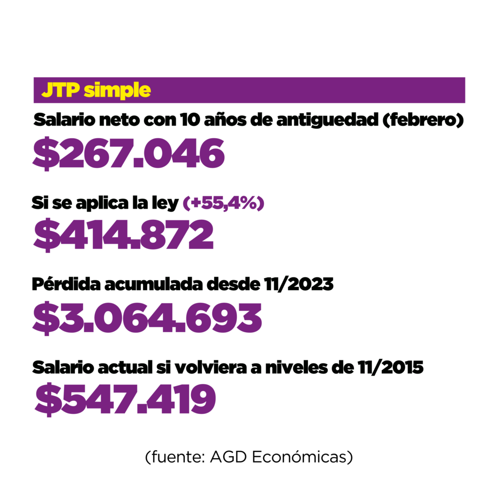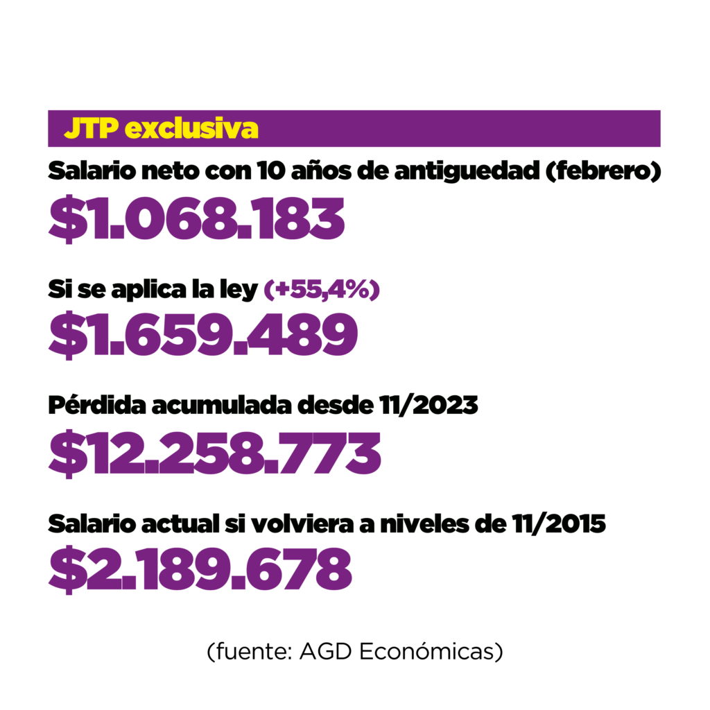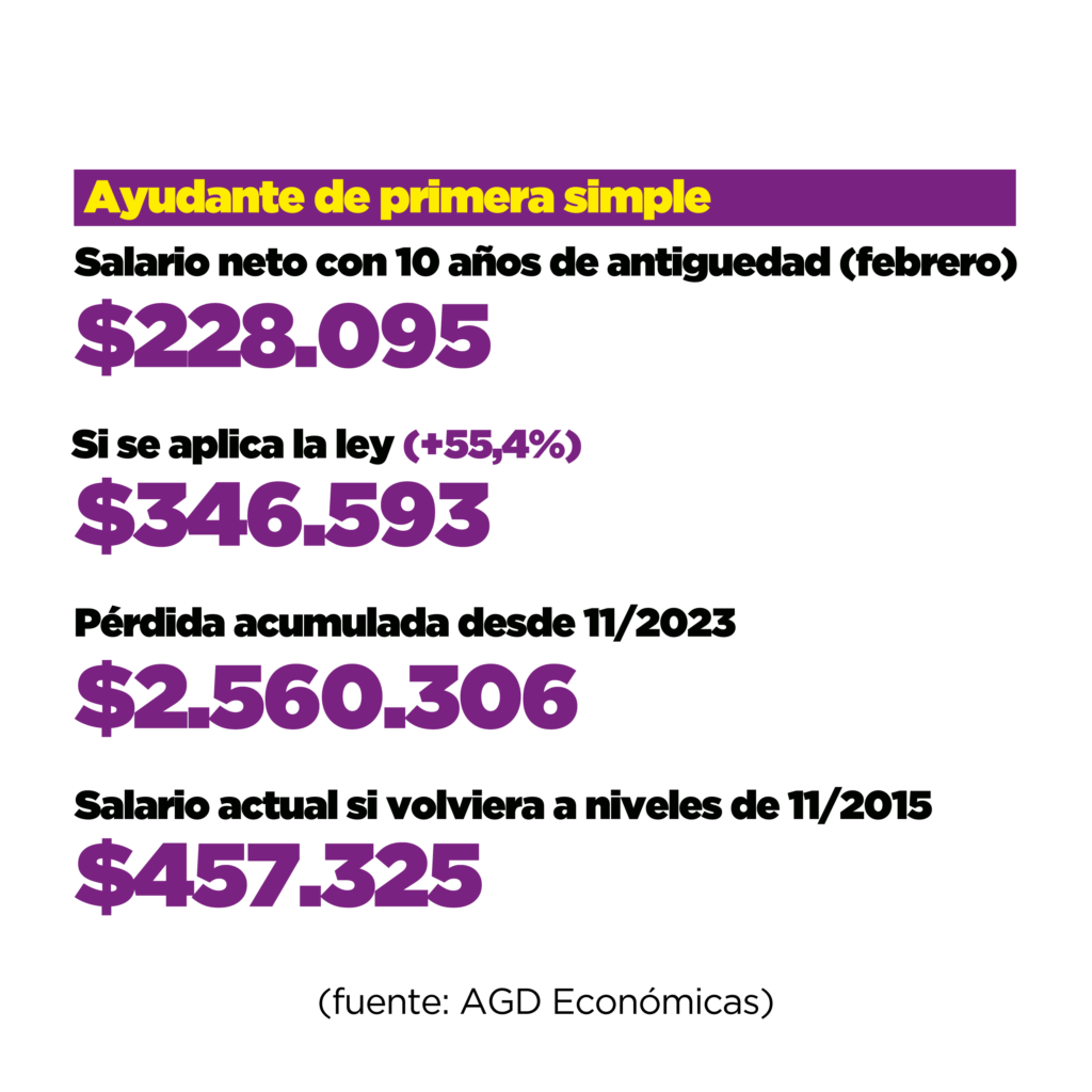 ▶️ Ayudante de primera simple Salario neto con 10 años de antiguedad $228.095 Si se aplica la ley (+55,4%) $346.593 Pérdida acumulada desde 11/2023 $2.560.306 Salario actual si volviera a niveles de 11/2015 $457.325 ▶️ JTP Simple Salario neto con 10 años de antiguedad $267.046 Si se aplica la ley (+55,4%) $414.872 Pérdida acumulada desde […]